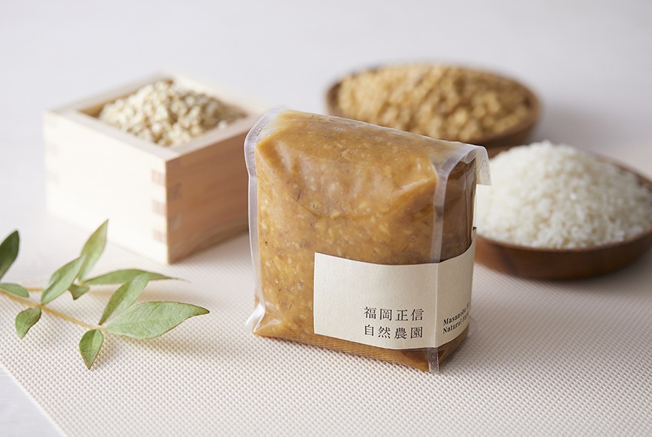 当園で栽培した自然農法の麦とお米で仕込んだ「はだか麦味噌」。