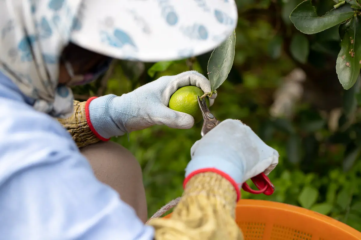 農家にとっては、トゲがあるので収穫が大変!ということが真っ先に挙げられる。それだけ、希少性がある反面、生産性がとても悪いと言って過言ではない柑橘がライムなのだ。また小さな実であるがゆえに、一つずつ収穫するには、忍耐力が必要。農園では、今年の恵みに感謝しながら、慣れた手つきで皆が協力しながら収穫をしています。
